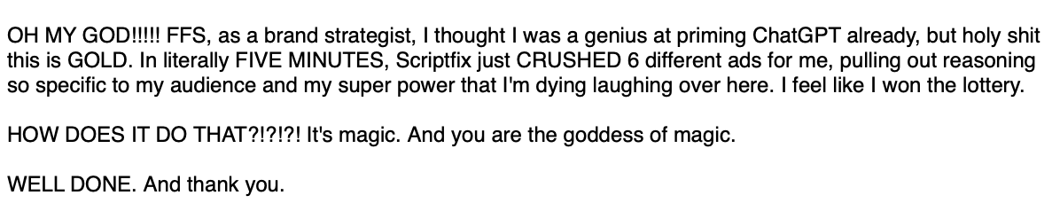 Completely. Regular ChatGPT writes generic scripts full of AI tells and phrases that make people scroll faster. ScriptFlix has been custom-trained on frameworks that actually convert, with built-in phrase elimination and voice matching that doesn't sound like a robot's attempting human cosplay.